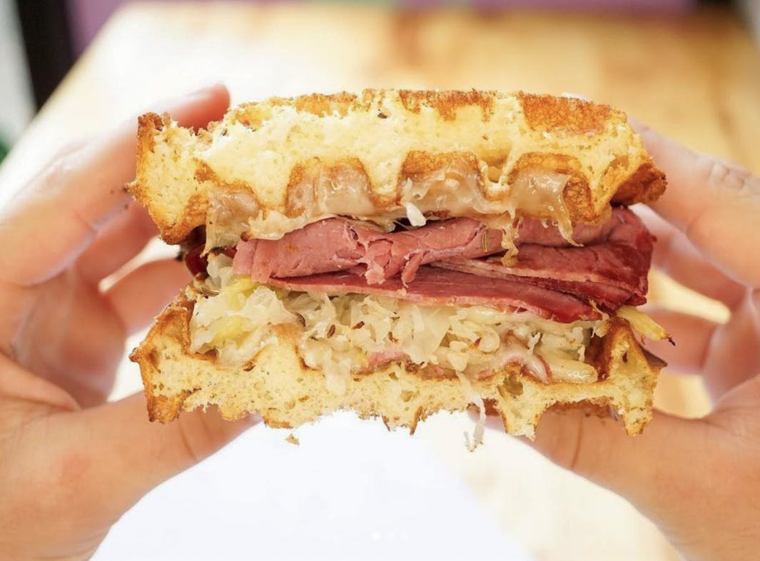 Corned beef, sauerkraut, Swiss cheese, kimchi aioli and caraway seeds make up the “Locals Only” waffle at Sweet As Waffles in downtown Bellingham, Wash. on Oct.10, 2023. This waffle is part of their new fall menu as they embrace the cold season. // Photo courtesy of Sweet As Waffles