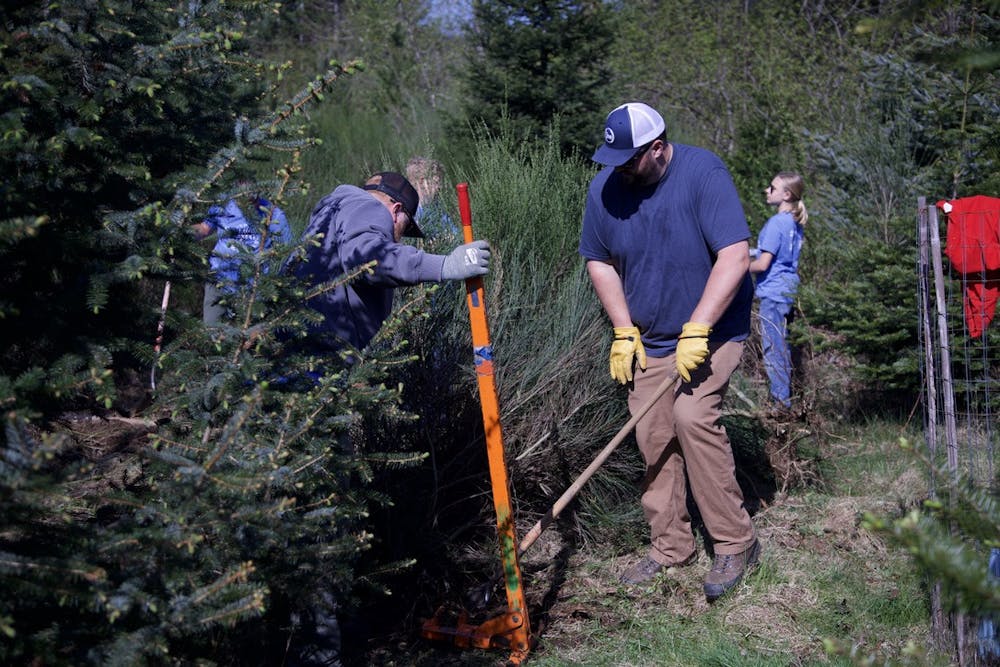 Volunteers use weed wrenches and shovels to remove invasive Scotch broom on Saturday, April 26, in Maple Falls, Wash. Volunteers showed up at Maple Creek Reach for an Earth Day event, hosted by Nooksack Salmon Enhancement Association and Whatcom Land Trust, to help protect salmon habitat. // Photo by Liam Walsh