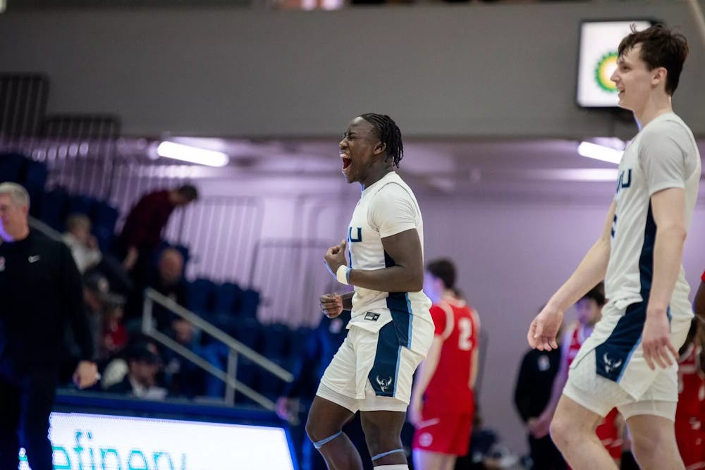 Tijan Saine goes up for a shot at Carver Gym on Feb. 22, 2025. The week before this game, Saine was named GNAC player of the week for Feb. 11 through 17. // Photo by Charlie Arcese, courtesy of WWU Athletics
