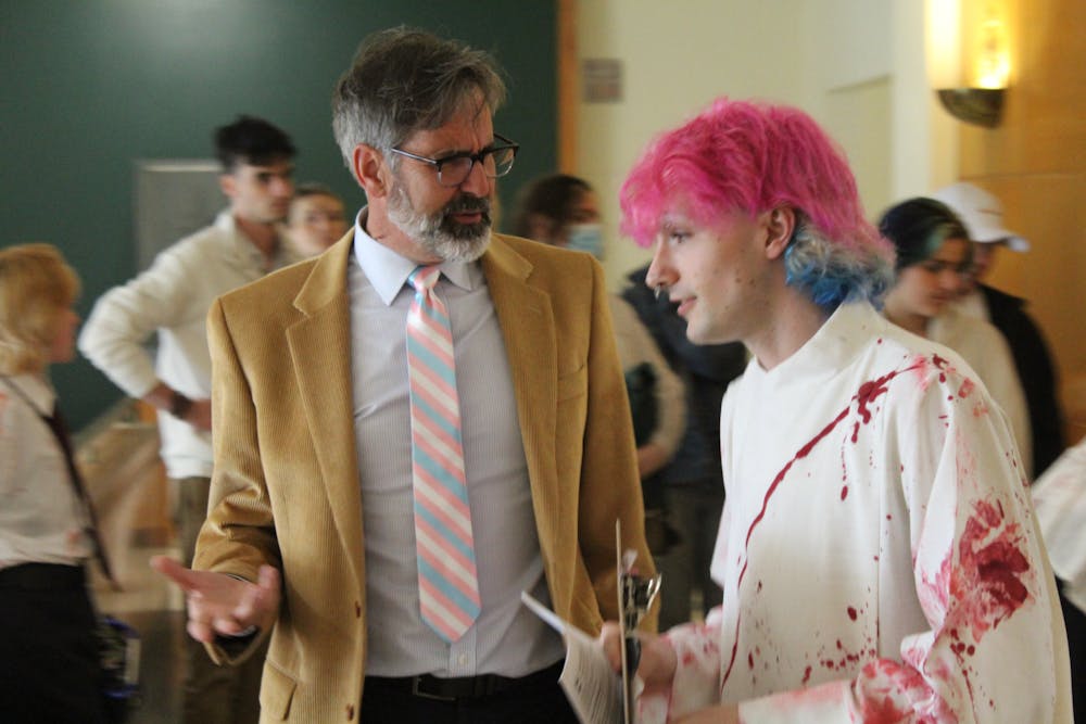 City Council member Michael Lilliquist confers with Trans Survival organizer Selene Etheredge outside Bellingham City Hall’s main chamber in Bellingham, Wash., on May 19, 2025. Lilliquist’s tie bears the pattern of the transgender pride flag. // Photo by Jae Ranney