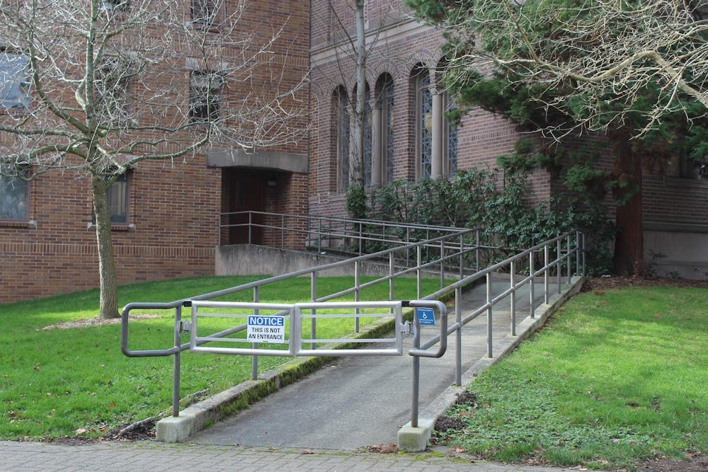 A ramp sits outside Wilson Library in Bellingham, Wash. on Jan. 23, 2025. A sign reads, “Notice. This is not an entrance.” // Photo by Jae Ranney