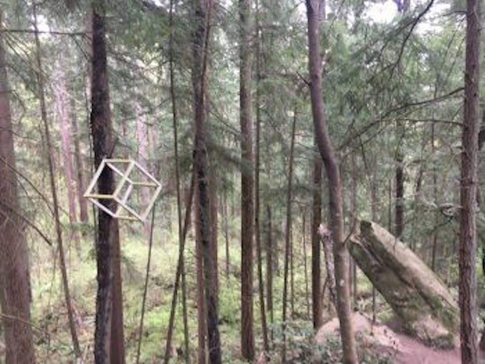 A cube hangs gracefully suspended amongst the trees in April 2020. What is it doing there? Who does it belong to and where will it go? The Front does not know. // Photo by Nate Sanford.