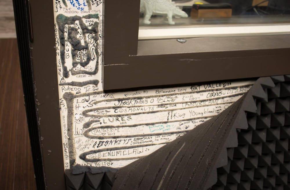 A wall in the recording studio with torn soundproofing, where bands have written their names located in the Viking Union in Bellingham, Wash., on Feb. 20, 2026. These were left on the wall back in 2012. // Photo by Katherine Rogers