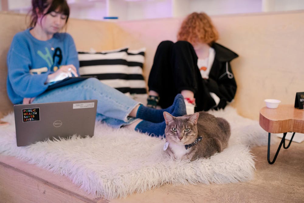 Two people working on laptops inside NEKO: A Cat Cafe on July 12, 2023, in Bellingham, Wash. A cat accompanies them on a plush rug. // Photo courtesy of Rae Kearns