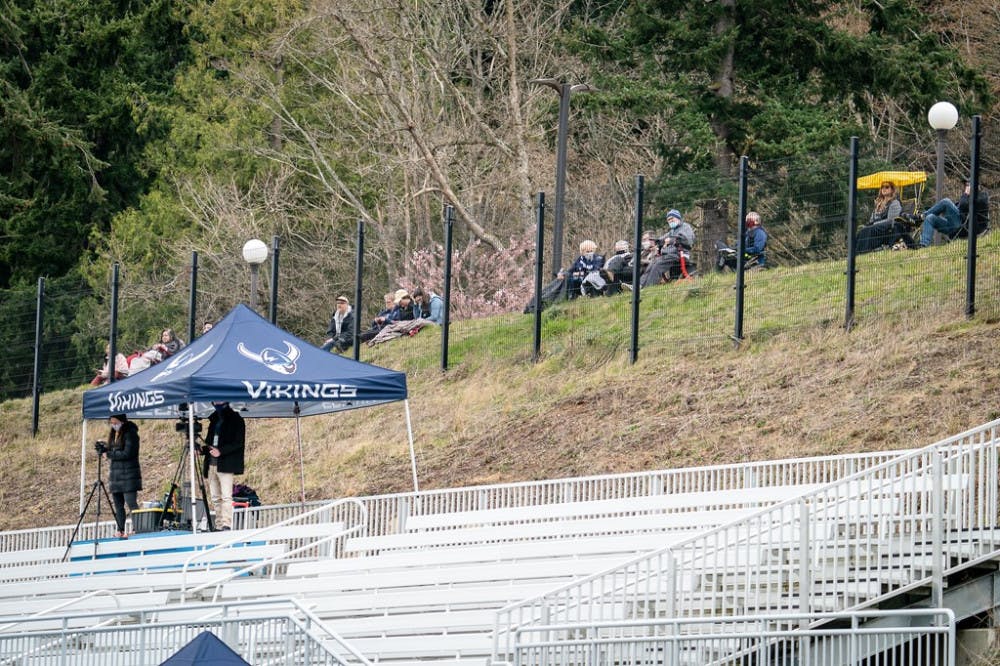 Fans sit outside the fence of Robert S. Harrington Field during The Vikings Women’s Soccer match against Pacific Lutheran University in Bellingham, Wash. on April 3, 2021. Sports fans have not been permitted inside any university game or event due to COVID-19. // Photo courtesy of Max Aquino.