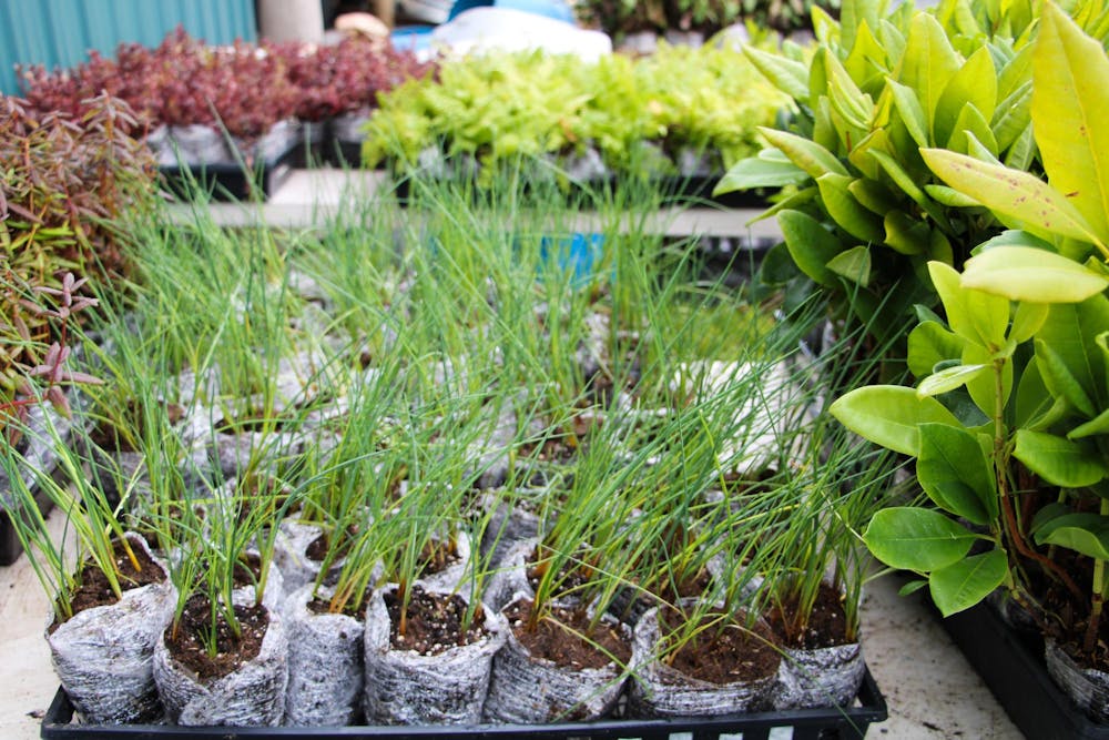 Tables lined with bare-root shrubs, perennials and groundcovers, on March 15, 2025, at the Whatcom Native Plant Sale, at Pioneer Park in Ferndale, Wash. Laid at the center of the photo is the perennial Baregrass (Xerophyllum tenax). It grows long stalks, with white, flowering petals at the top, and blooms in the late spring to early summer. // Photo courtesy of Whatcom Conservation District