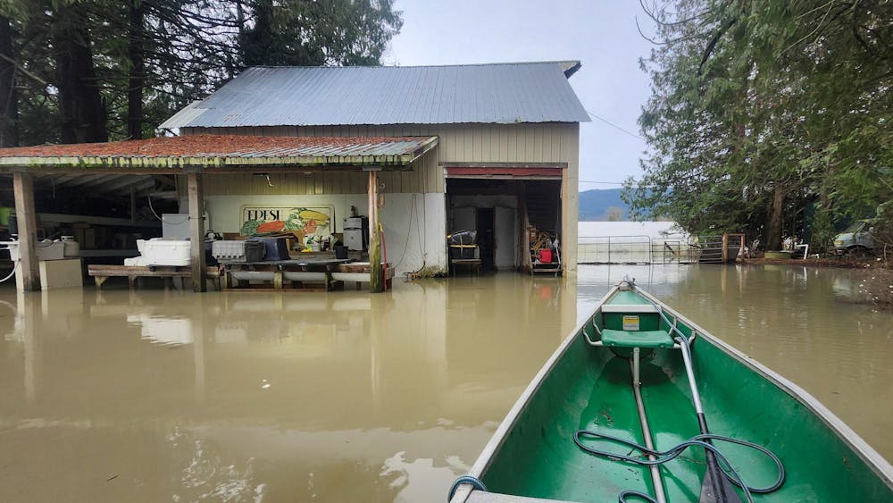 Colin Fischer, of Wanderwood Farm, paddles out to assess the damage on his property on Dec. 11, 2025. The road leading to the farm was inaccessible due to the flooding, adding to a long list of obstacles. // Photo courtesy of Colin Fischer