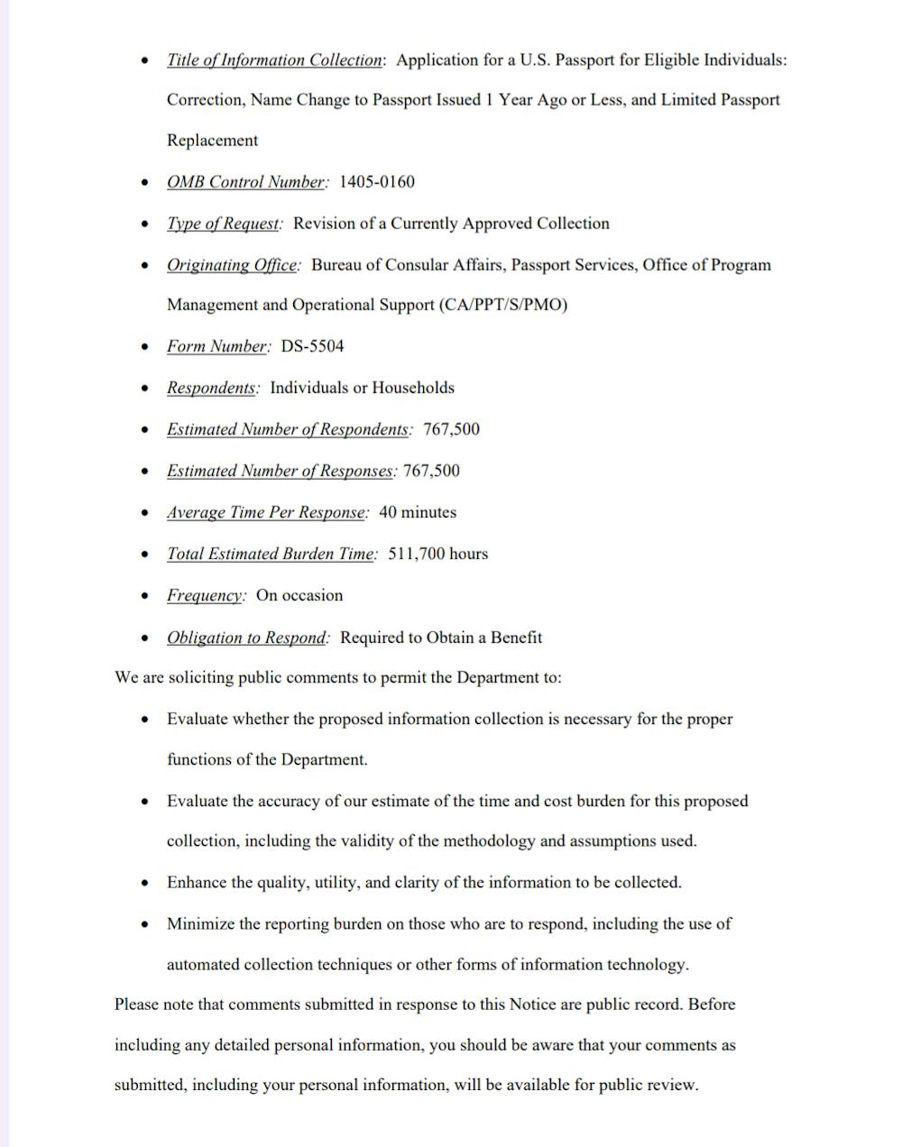 Page two of a notice from the State Department regarding changes to one of its passport application forms. This notice was published on Feb. 18, 2025. // Notice courtesy of the State Department