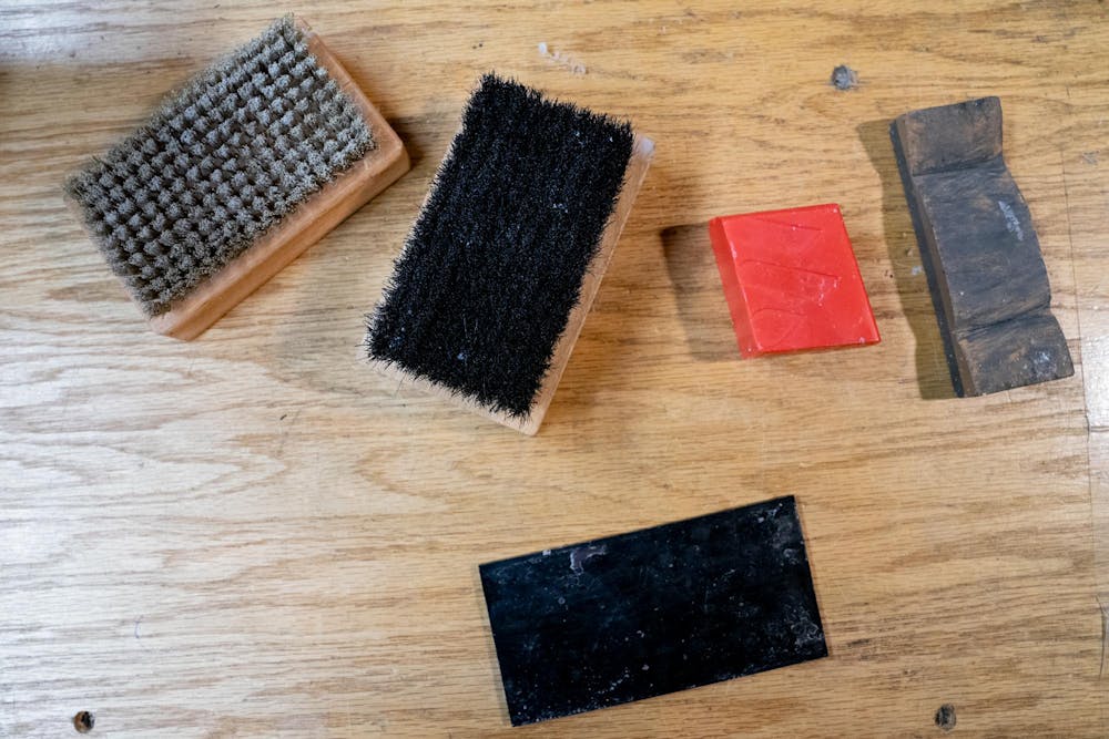 Kegan Thompson’s ski tuning tools pictured on Thursday, Jan. 30, 2025, in Bellingham, Wash. The tools include brushes, a scraper, a block of wax and a gummy stone. // Photo taken by Eli Voorhies