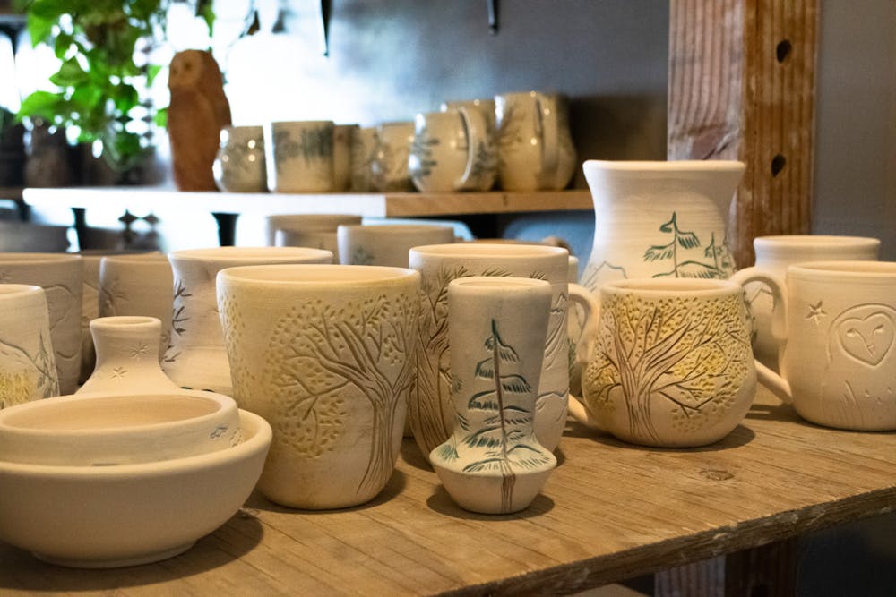 Some of AnnMarie Cooper’s work, glazed and waiting to be fired, at Starflower Studios in Bellingham, Wash., on Nov. 7, 2025. These vessels are adorned with stylized illustrations of nature. // Photo by Sophia Jellinghaus