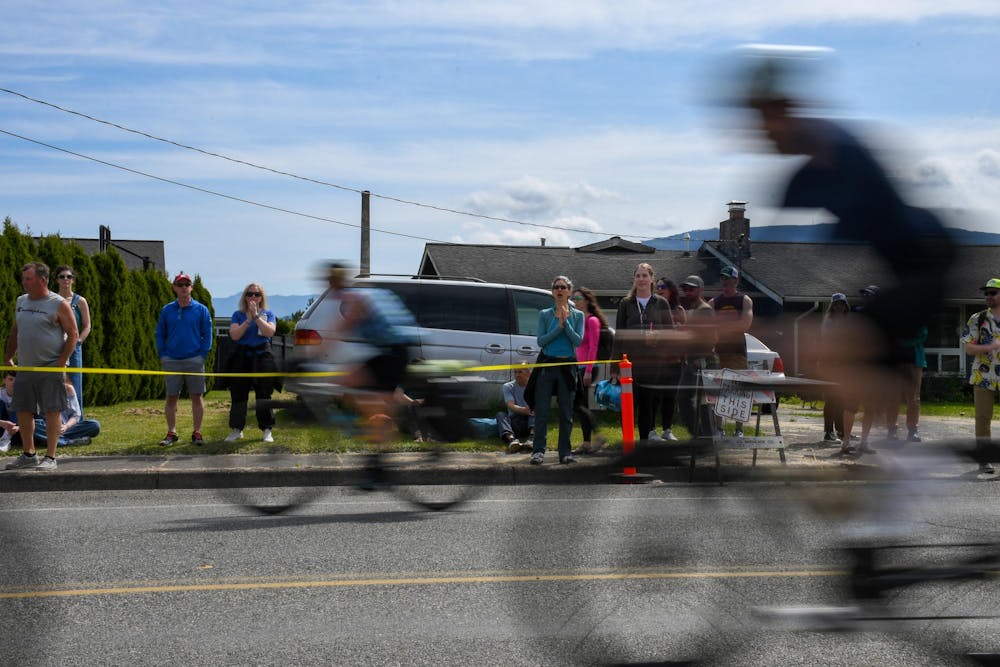 Spectators cheer on the side of the road as racers ride past on the road bike leg on May 25, 2025. The road bike is another high-leverage leg of the race, with the winners completing it in just under 90 minutes. // Photo by Caitlin Grygorcewicz