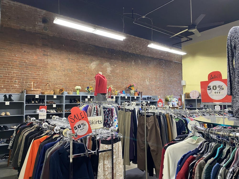 The inside of Y’s Buys Thrift Boutique on Feb. 13, 2025, in Bellingham, Wash. There are racks of various clothing items with signs reading “50% off.” // Photo by Sophia Raymond