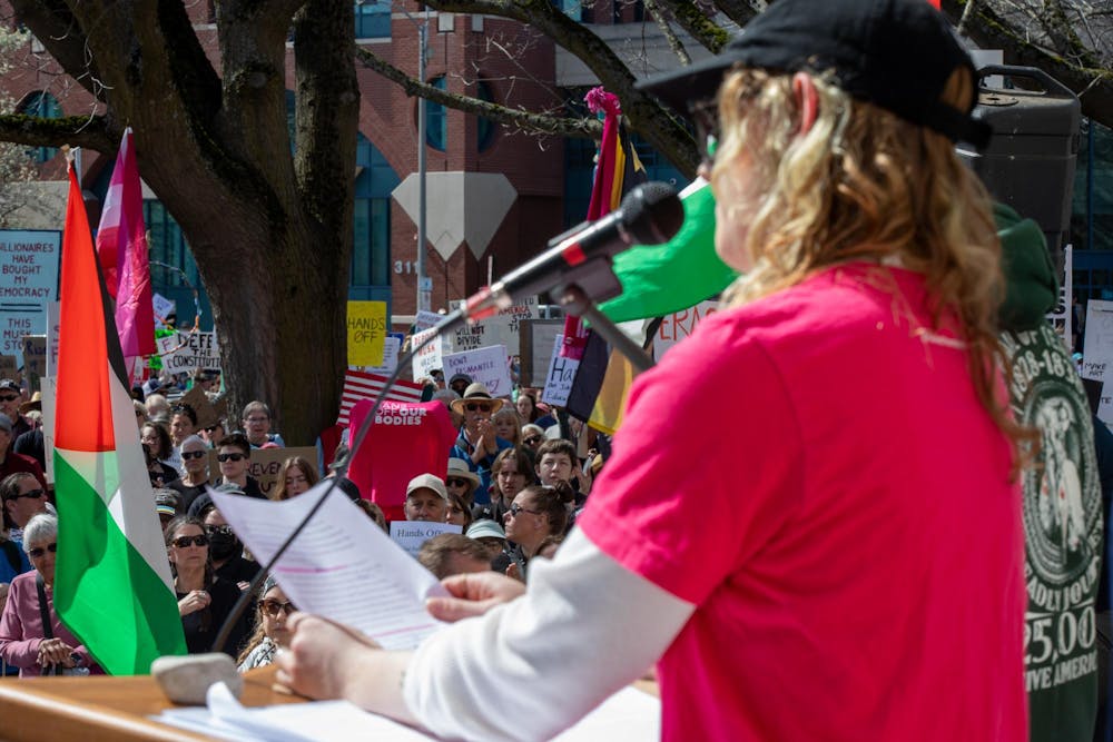 Jade Phillips, community organizer and data manager at Mt. Baker Planned Parenthood, delivers a speech outside of Bellingham City Hall at the “Hands Off!” protest on Saturday, April 5, 2025. // Photo By Caitlin Grygorcewicz