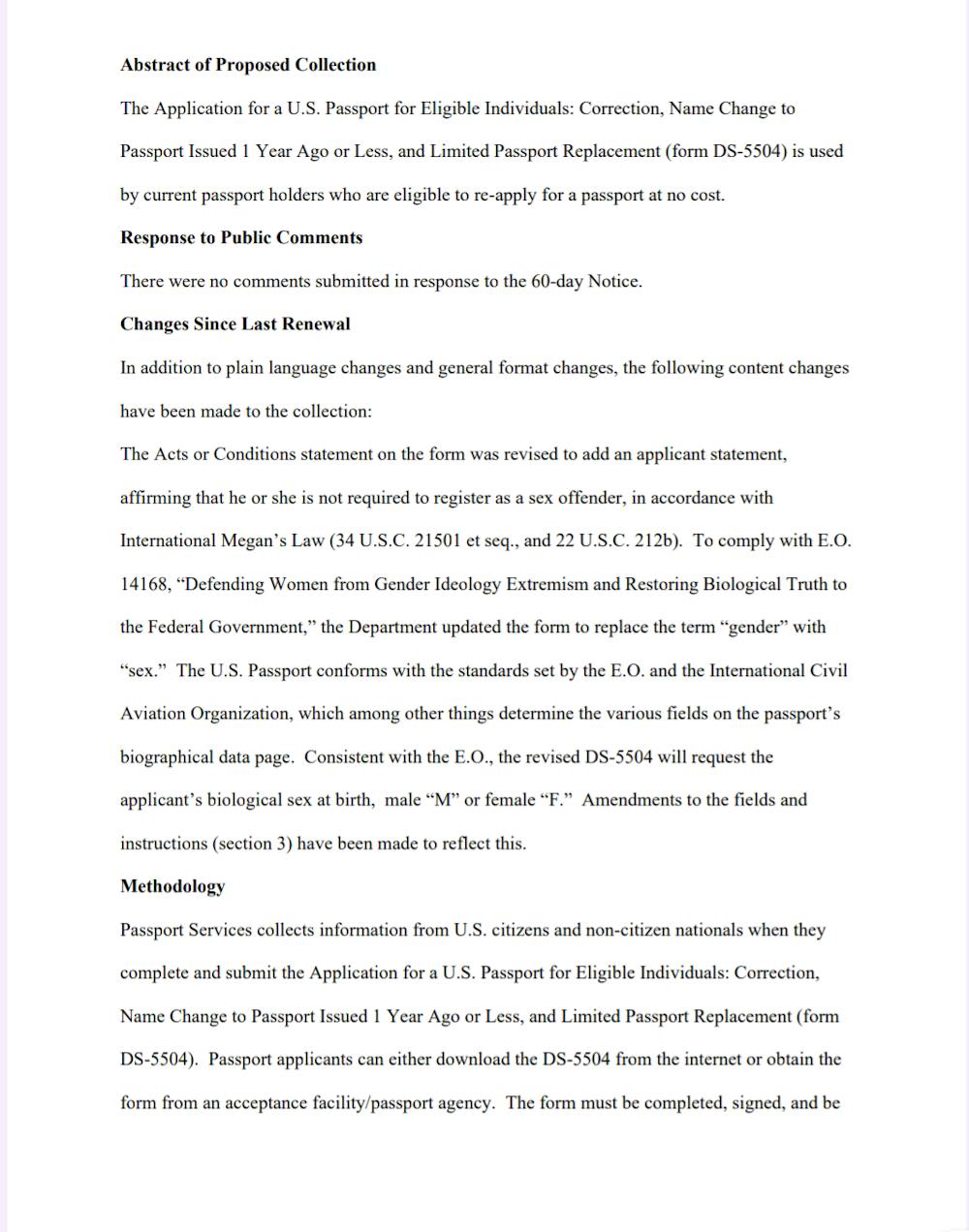 Page three of a notice from the State Department regarding changes to one of its passport application forms. This notice was published on Feb. 18, 2025. // Notice courtesy of the State Department