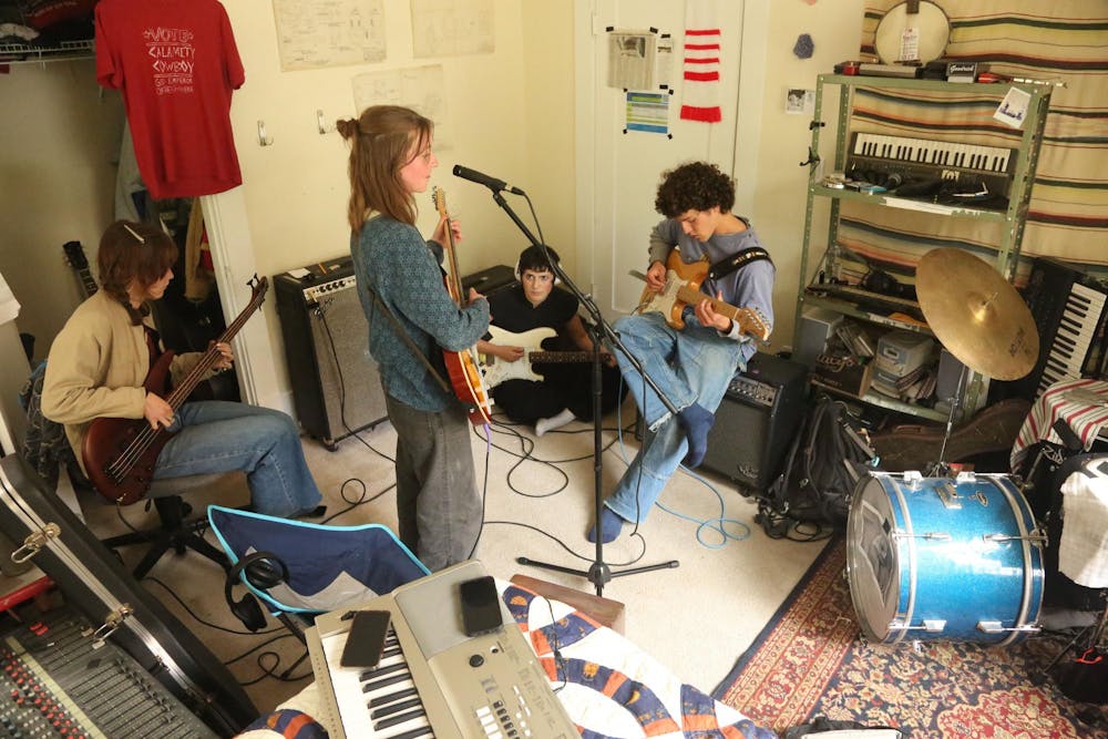 (Left to right) Abby Knipe (20), Riley Thayer (21), Leila White (21) Dustin Valdes (20) and Sean Atkins (20, not pictured, on drums) practice in their apartment on May 24,2024. Thayer says the band feels most creative when someone brings in a new song idea and they get to start working on it. // Photo by Genesi Funston