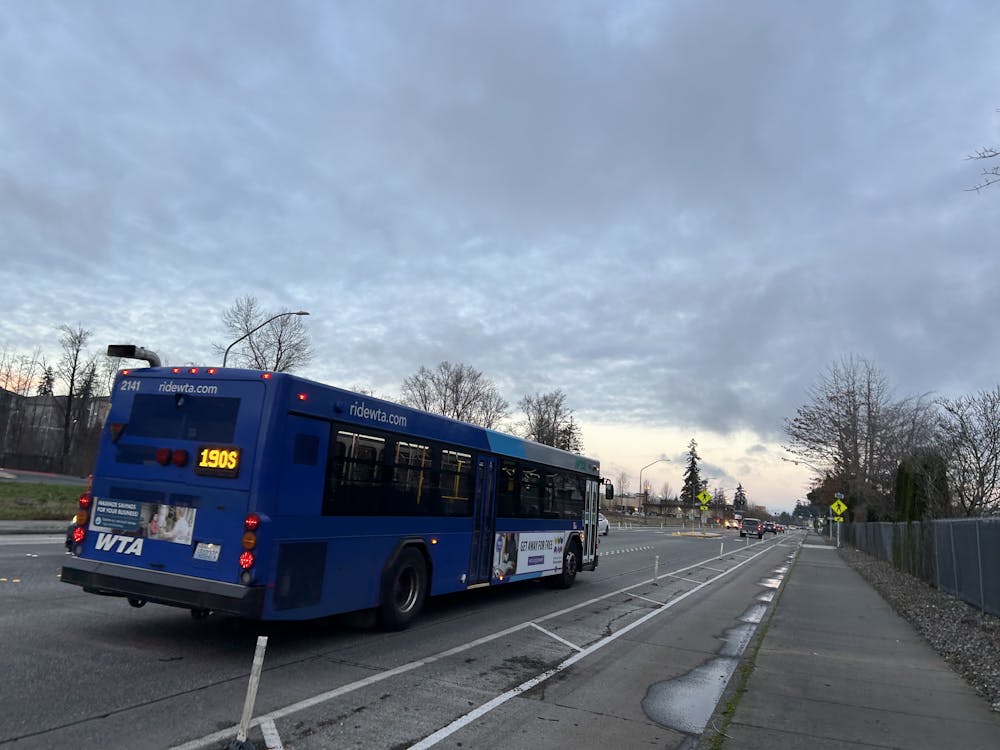 A WTA Route 190 transit bus pictured on Jan. 8, 2025, in Bellingham, Wash. The bus is leaving the Viking Circle bus stop. // Photo by Mabaindu Mbawa