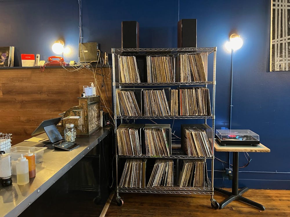 Pel’meni’s cashier and vinyl station is pictured on Sep. 3, 2024, in Bellingham, Wash. Customers can check out the store’s music collection and maybe even throw on a record. // Photo by Madi Tessem