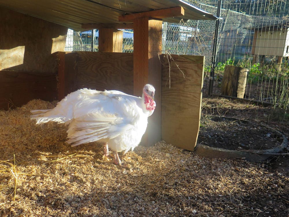 Elf Sanctuary’s turkey, Posey, struts in the waning light in Ferndale, Wash., on Jan. 23, 2026. She was born with a limp, and has to hold out her wings to stabilize herself when she walks. // Photo by Noelle Reger