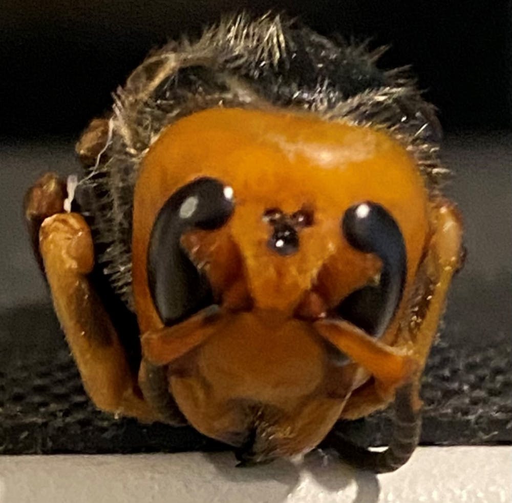 Close up of an Asian giant hornet. This hornet was part of one of the first nests found in Whatcom County. // Photo courtesy of Brad Cash and John Reynolds.