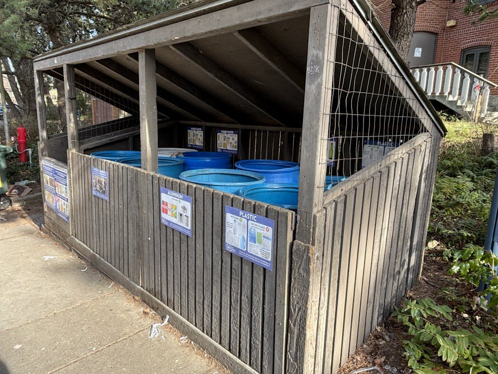 The recycling bins outside the Ridgeway Alpha dorm building, across from the Ridgeway Commons building on Feb. 11, 2025, in Bellingham, Wash. Western maintains 650 recycling bins across campus, including academic buildings, residence halls and dining areas. // Photo by Hope Rasa