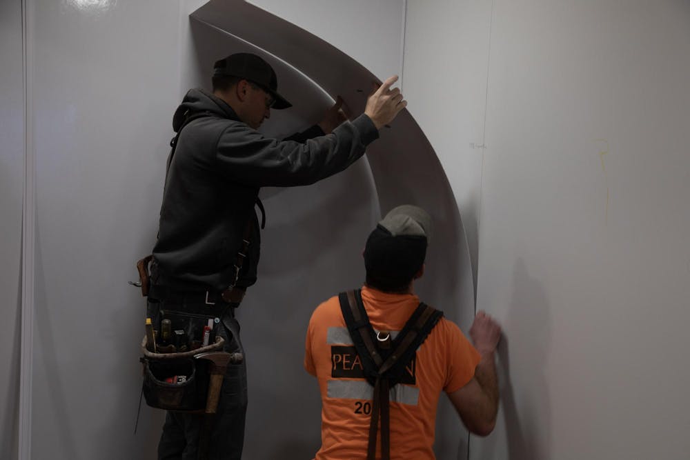 Griffin Thompson and Chris Poortinga from Tiger Pearson Construction take measurements for the walls of a future bathroom at the shelter on Feb. 3, 2025, in Bellingham, Wash. The facility will feature a shared bathroom and a shower room. // Photo by Steven Colson