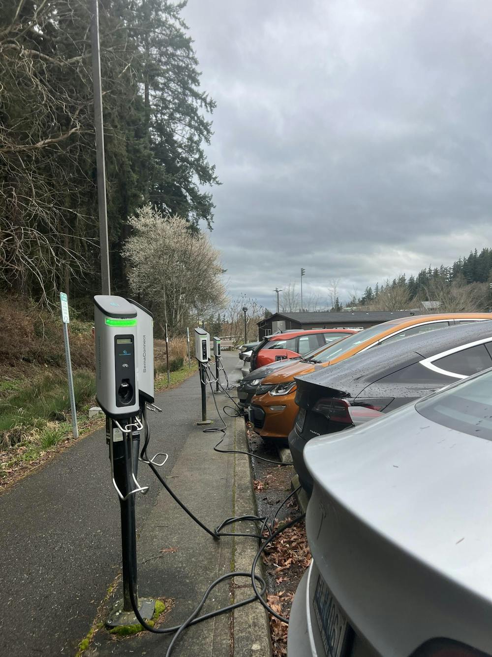 The electric vehicle charging station in Parking Lot 12G outside Fairhaven College supports students and staff who commute via electric vehicles over gas-powered options. This investment in clean transportation infrastructure reflects Western’s Sustainability Action Plan commitment to cutting campus emissions. // Photo by Karsin Hutchins