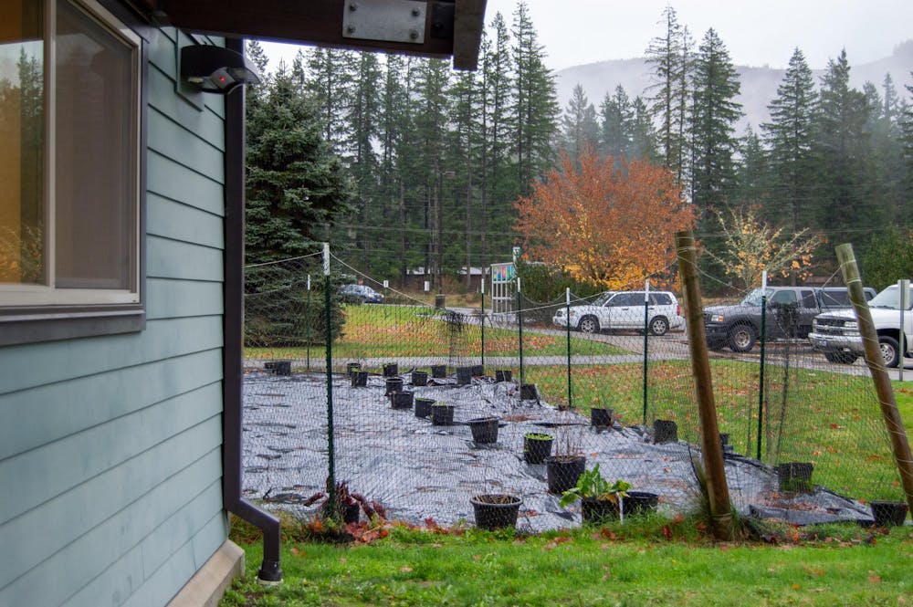 A fenced garden sits alongside the Foothills Food Bank building in Maple Falls, Wash., on Nov. 6, 2025. The garden is one of several outdoor areas surrounding the facility. // Photo by Janessa Bates