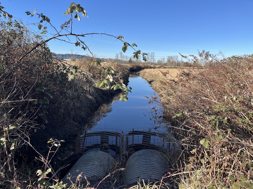 A culvert outlet that leads to a one-way tide gate in Swans Trail Slough in Snohomish, Wash., on Jan. 31, 2025. Both features could be removed in an upcoming project by the Snohomish Conservation District. // Photo by Steven Colson