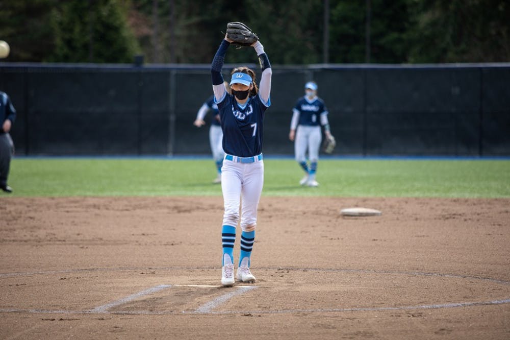 Senior Viking athlete Anna Kasner pitching in a game against Saint Martin’s University on March 21, 2021. Kasner led Viking softball to win the 2021 GNAC Championship. // Photo courtesy of WWU Athletics