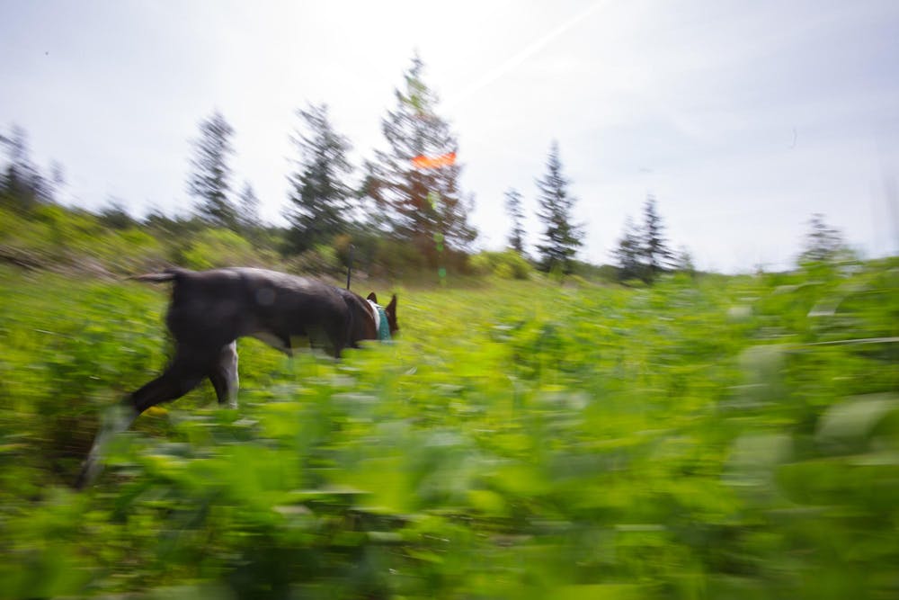 Phoebe follows her nose through a field of grass on April 29, 2025, at Galbraith Mountain in Bellingham, Wash. This is a display of Galbraith Trail Hounds' purpose: allowing dogs to decompress. // Photo by Ben Magnus