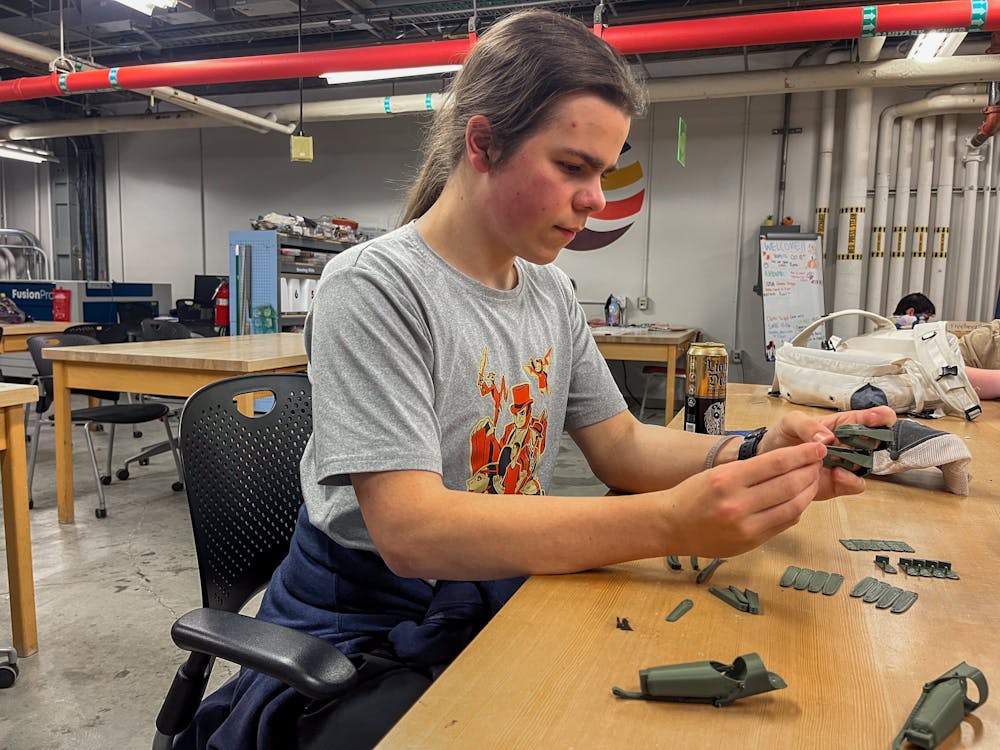 Zack Craven tries out his 3-D printed articulated hands that he made in the Makerspace. The costume fingers will create a full set of hands that Craven uses his own to control. // Photo by Rosalie Johnson