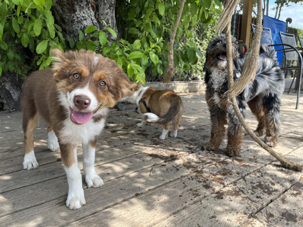 Three dogs in the outdoor area at Paws For A Beer in Fairhaven on July 29, 2023, in Bellingham, Wash. A dog is smiling in the foreground and two dogs are standing in the background. // Photo courtesy of Rylan Schoen
