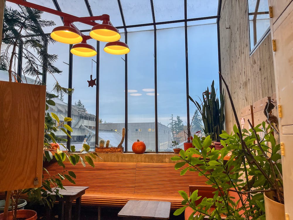 Located on the second floor of the Environmental Studies Building is a quaint corner surrounded by lush plants. This study spot offers beautiful views of the changing seasons with its panoramic windows. // Photo by Melody Marichalar