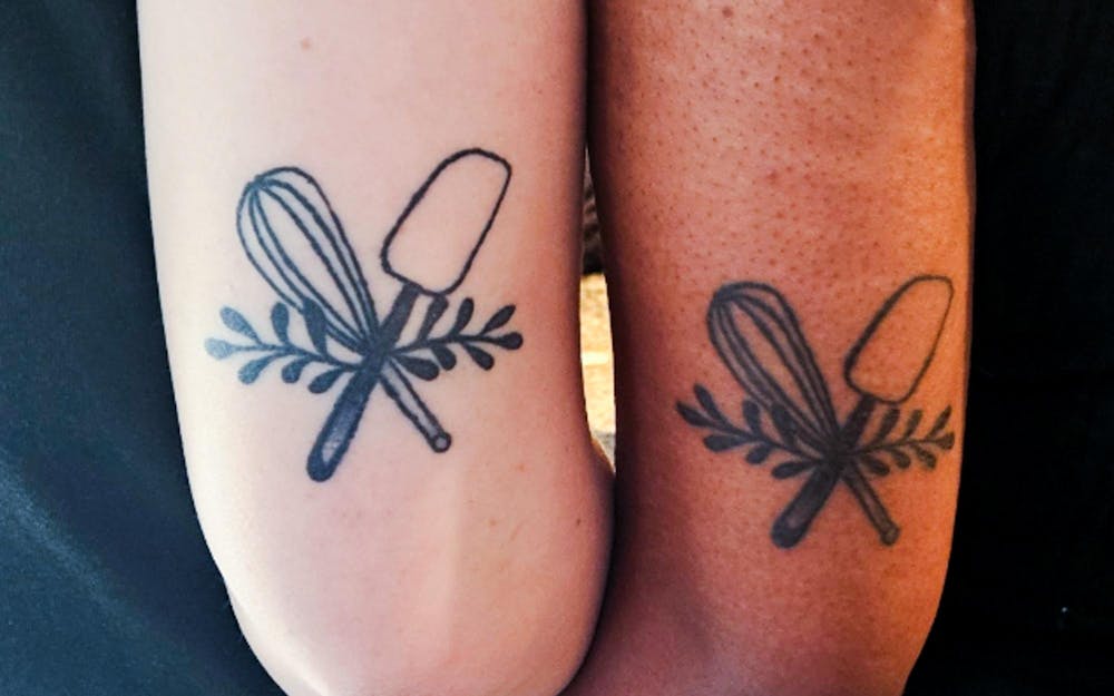 Two matching tattoos shown on Mishele Ross and Abby Davis, pictured on Feb. 20, 2025, by artist Pete Falcone at Colby Avenue Tattoo, located in downtown Everett, Wash. Colby Avenue Tattoo is open daily for walk-ins and appointments. // Photo by Mishele Ross