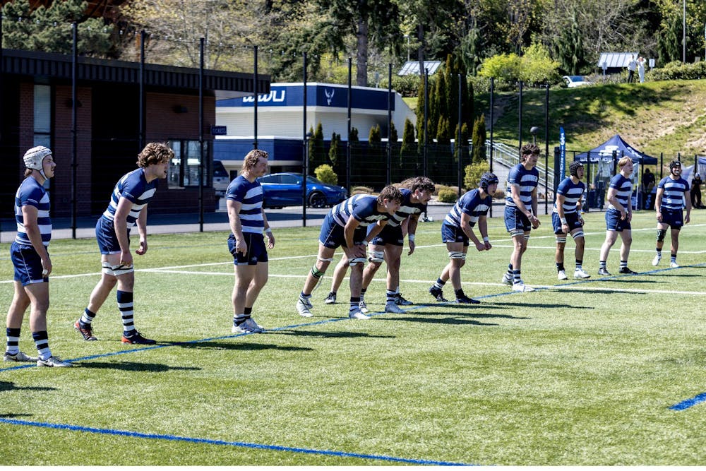 WWU men’s rugby waits for play to restart after the opposing team's try at Harrington Field on April 19, 2025. WWU men’s rugby won the 7s national championship last year. // Photo by Chayton Engelson
