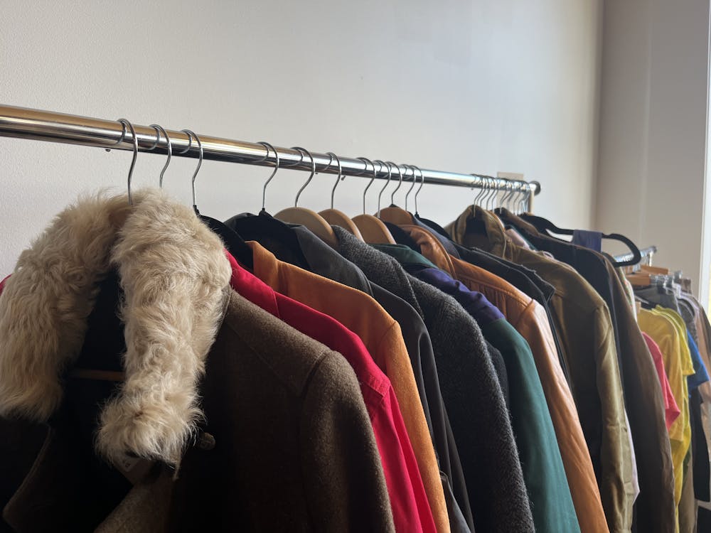 A rack of donated coats and other clothes displayed in Ragfinery’s store in Bellingham, Wash., on Jan. 16, 2026. Ragfinery staff and volunteers sort through thousands of pounds of donations per month. // Photo by Noelle Reger