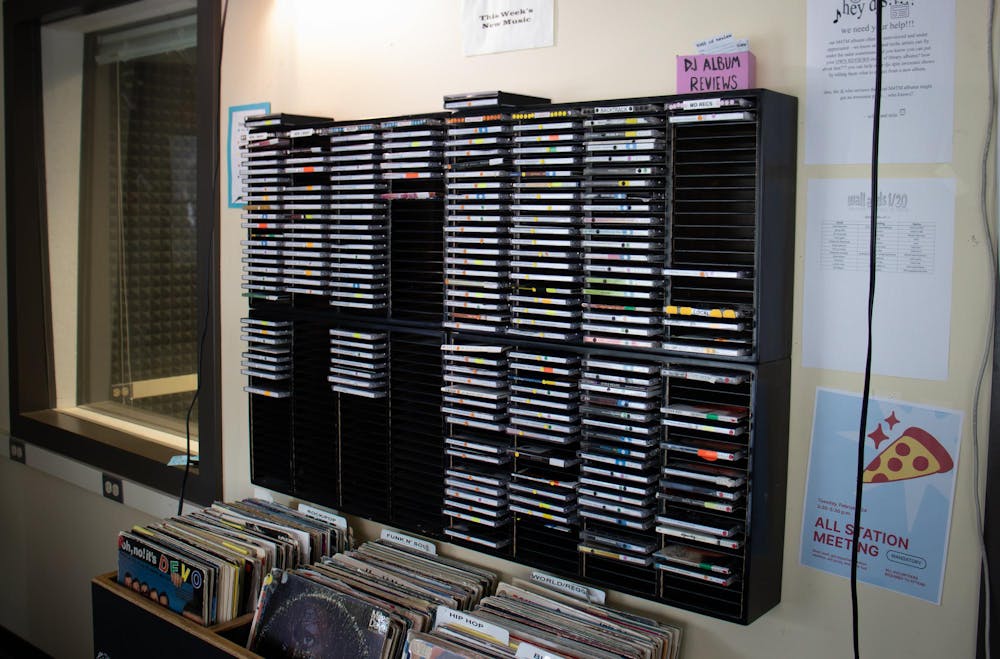 The CD shelf known to KUGS staff as ‘The Wall’, where new music of the week for student volunteer DJs is stored, located in the Viking Union in Bellingham, Wash., on Feb. 20, 2026. KUGS makes an effort to play music that has been released in the last six months. // Photo by Katherine Rogers