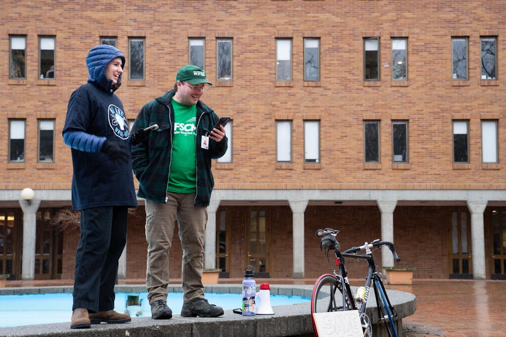 Paul Carlson and Mattie Horn orchestrated the rally and echoed the sentiments of the prior speakers at the Protect the Pie rally on Friday. Carlson is the president of WFSE’s WWU bargaining team, and Horn is the financial secretary on the executive board of WAWU. // Photo by Eli Voorhies
