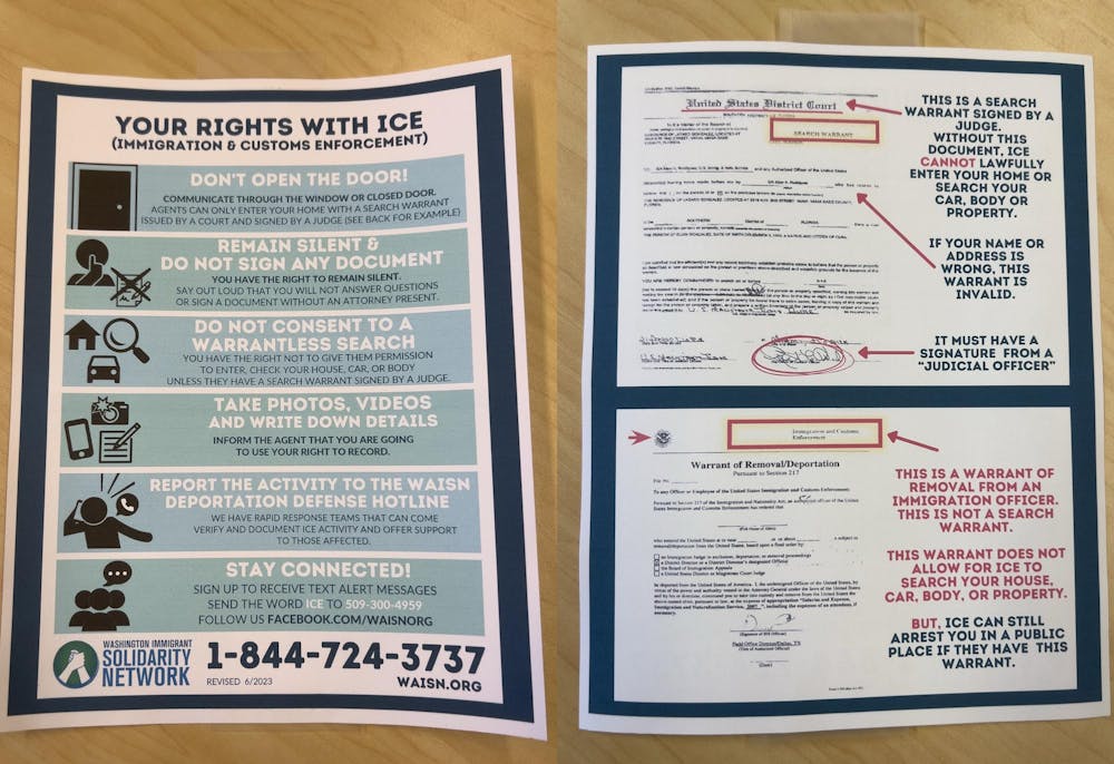 A flyer from the Washington Immigrant Solidarity Network, found in College Hall, explains immigrants' rights when interacting with ICE, including not opening the door without a judge-signed warrant, remaining silent and refusing consent to a warrantless search. The back side shows the difference between a judicial search warrant and an ICE administrative removal warrant. // Photo by Karsin Hutchins