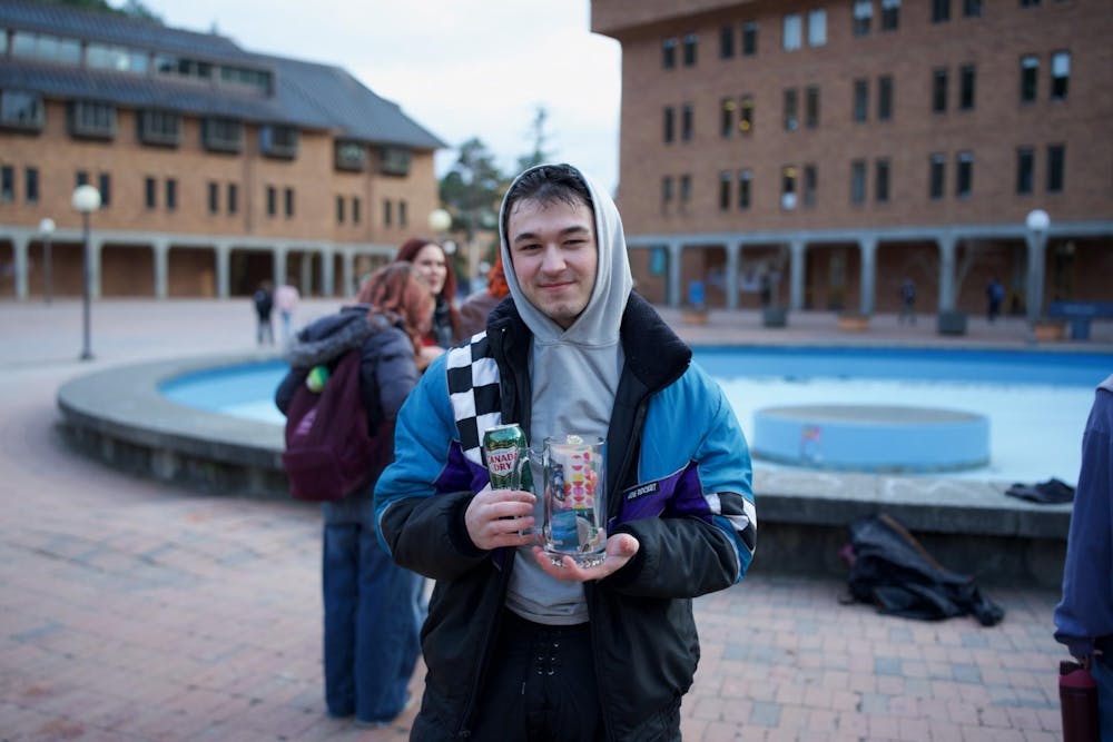 Braeden Rowland happily holds a beer mug filled with candy, condoms, and suckers in Red Square. This was his prize for winning the “Heated Rivalry Lookalike Contest” on Feb. 20, 2026. // Photo courtesy of Charlie Johnson