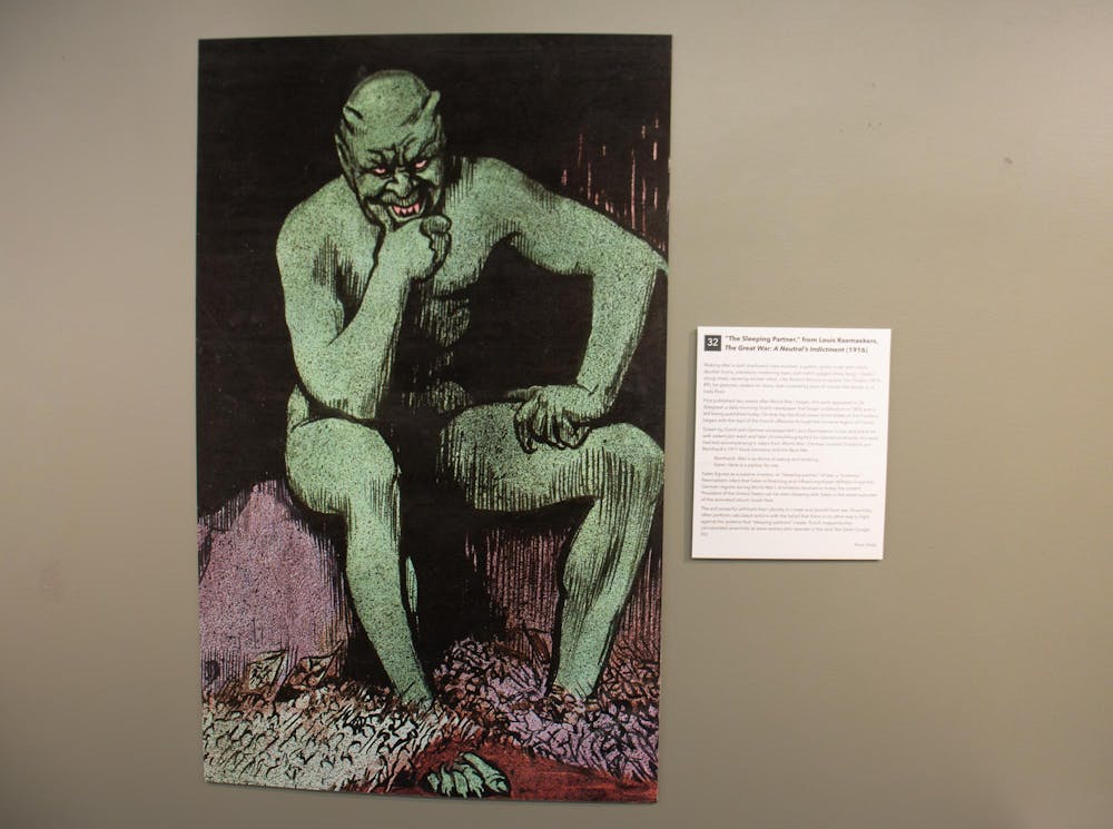 “Sleeping Partner” painting by Louise Raemaeker in 1916, hanging in Wilson Library’s Special Collections exhibit in Bellingham, Wash., on January 30, 2026. Student Ross Vitale wrote the accompanying wall text description and analysis. // Photo by Katherine Rogers