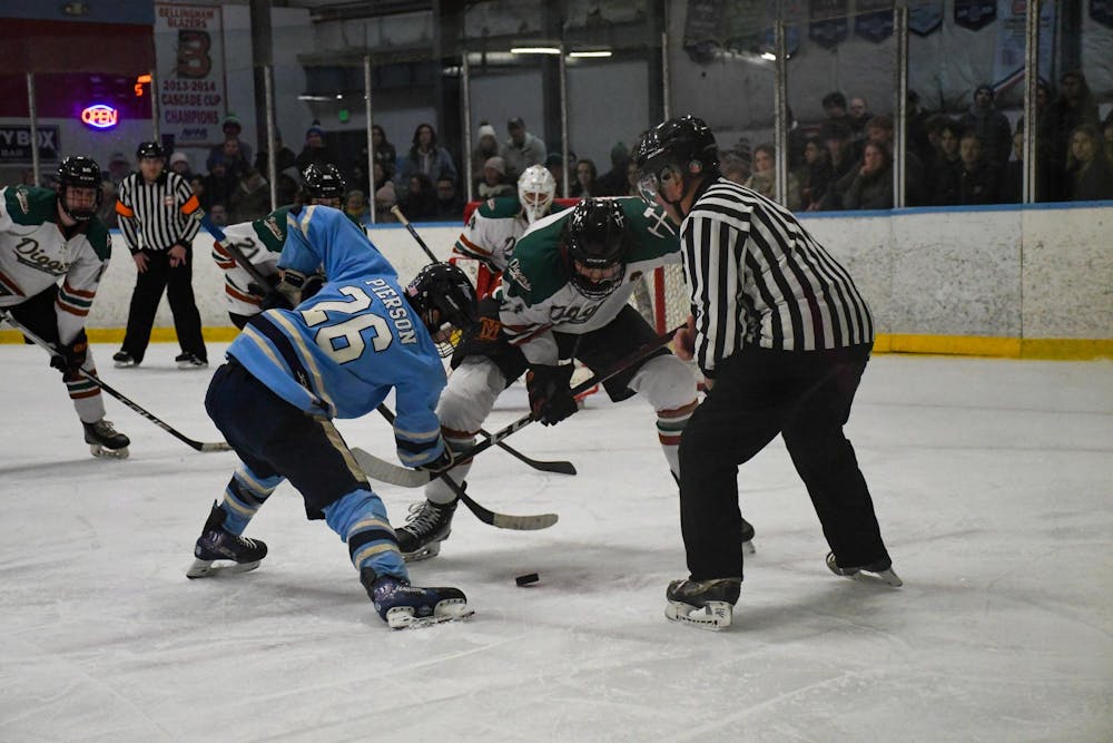 Patrick Pierson (26) prepares for a puck drop during a men’s hockey game against Montana Tech on Jan. 24, 2026, at the Sportsplex Arena in Bellingham, Wash. Pierson, team captain of the Vikings, was honored on senior night. // Photo by Caitlin Grygorcewicz