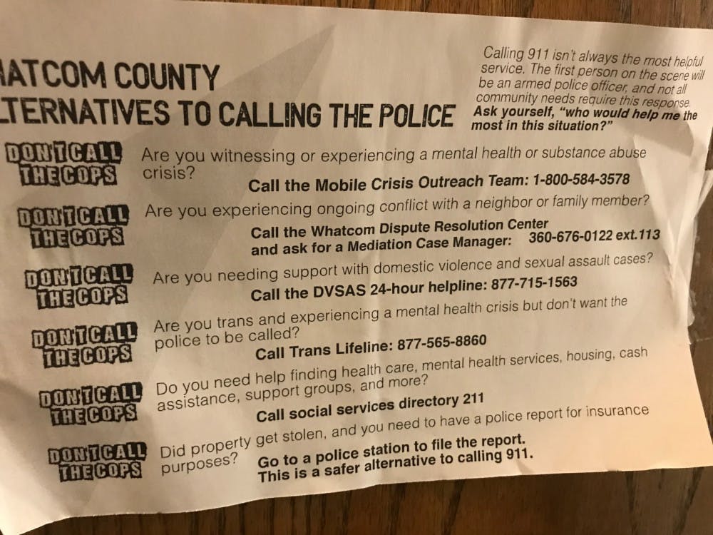 A flyer posted in the hallways of Western Washington University Fairhaven dorms displays a list of alternative numbers to calling the police. Among them, the Mobile Crisis Outreach Team, Whatcom Dispute Resolution Center and Domestic Violence and Sexual Assault Services. // Photo by Kate Yeoman