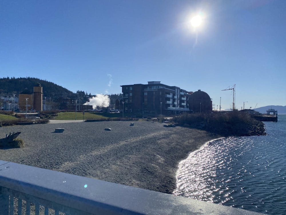 The beach at Waypoint Park on Feb. 10, 2025, in Bellingham, Wash. The sun is shining and a statue is displayed in the background. // Photo by Sophia Raymond