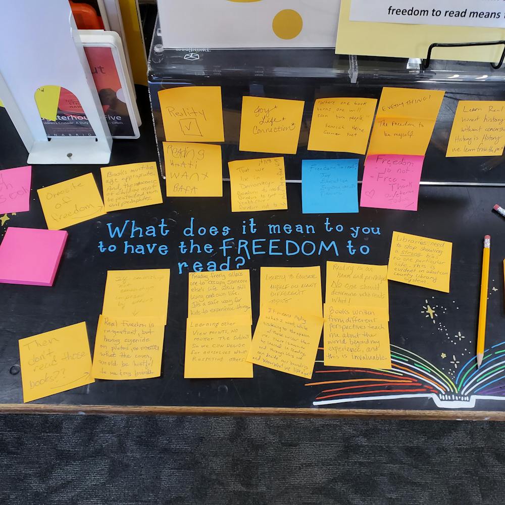 Lynden Library’s interactive display, where visitors share their thoughts on censorship and the freedom to read on Sept. 24, 2024, in Lynden, Wash. The display coincided with Banned Books Week. // Photo courtesy of Lisa Gresham, Whatcom County Library System