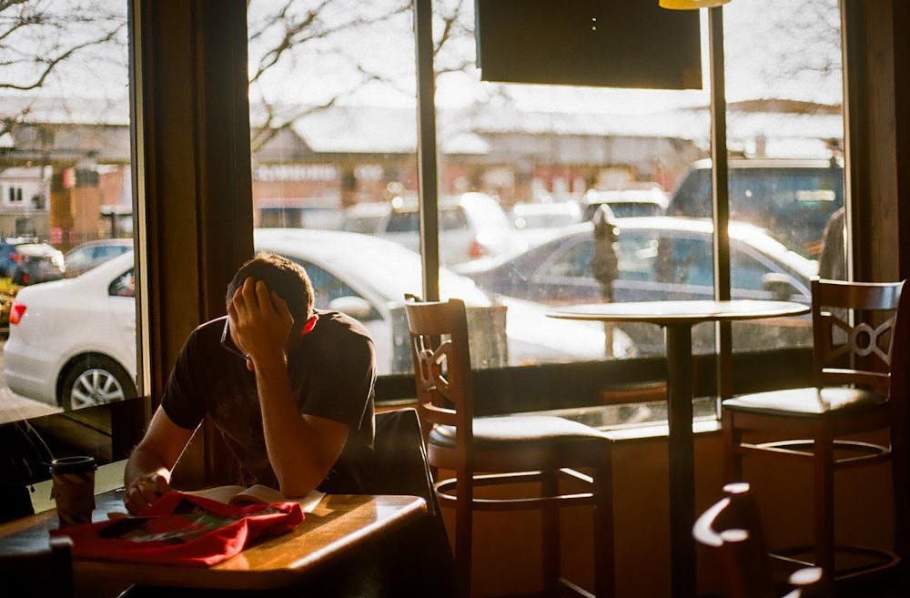 A customer sits alone at a table at Cafe Adagio on Feb. 6, 2024 in Bellingham, Wash. Solo diners can offer a brief pause in a shift often spent juggling multiple drinks and tip-driven expectations. // Photo courtesy of Griffin Rinauro