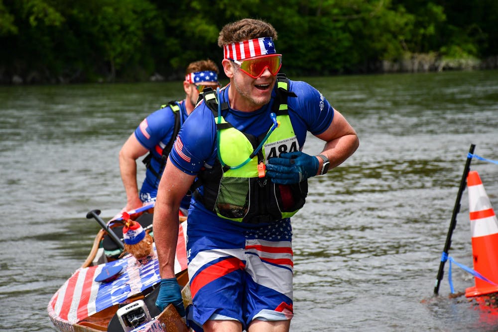 Decked out in red, white and blue, a team rushes onto the riverbank to conclude the canoe leg of Ski to Sea on May 25, 2025. The canoe leg is the longest event in the race, with the fastest team finishing in just under two hours. // Photo by Caitlin Grygorcewicz
