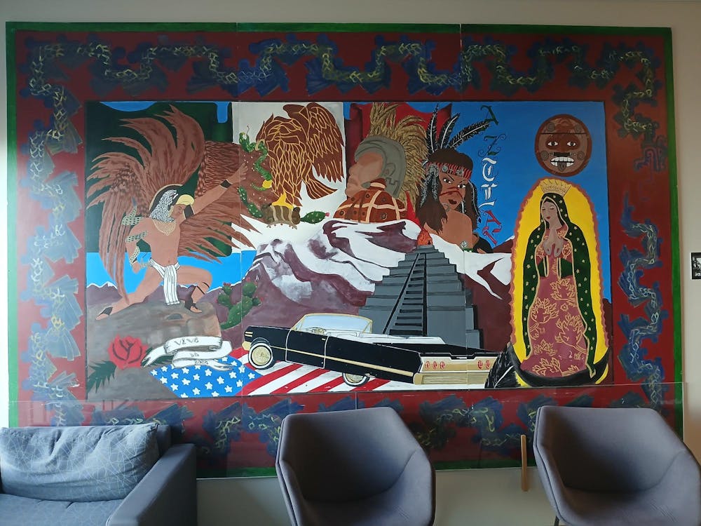A mural depicting various cultural iconography is placed on a wall in the Ethnic Student Center at Western Washington University in Bellingham, Wash. on March 5 2025. Well-lit seating areas in the Ethnic Studies, such as the one pictured here, offer spaces for students to connect. // Photo by Josh Hernandez