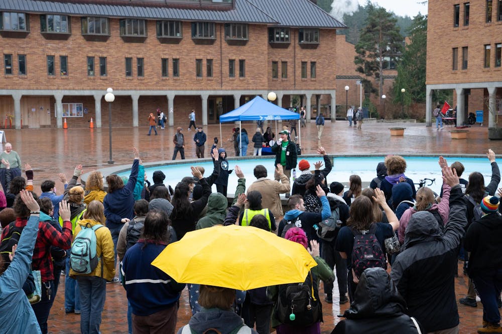 The assembly plays the game “Raise your hand” at the Protect the Pie rally on Friday. Led by speakers Paul Carlson and Mattie Horn, it showed that students have a lot of struggles in common. // Photo by Eli Voorhies