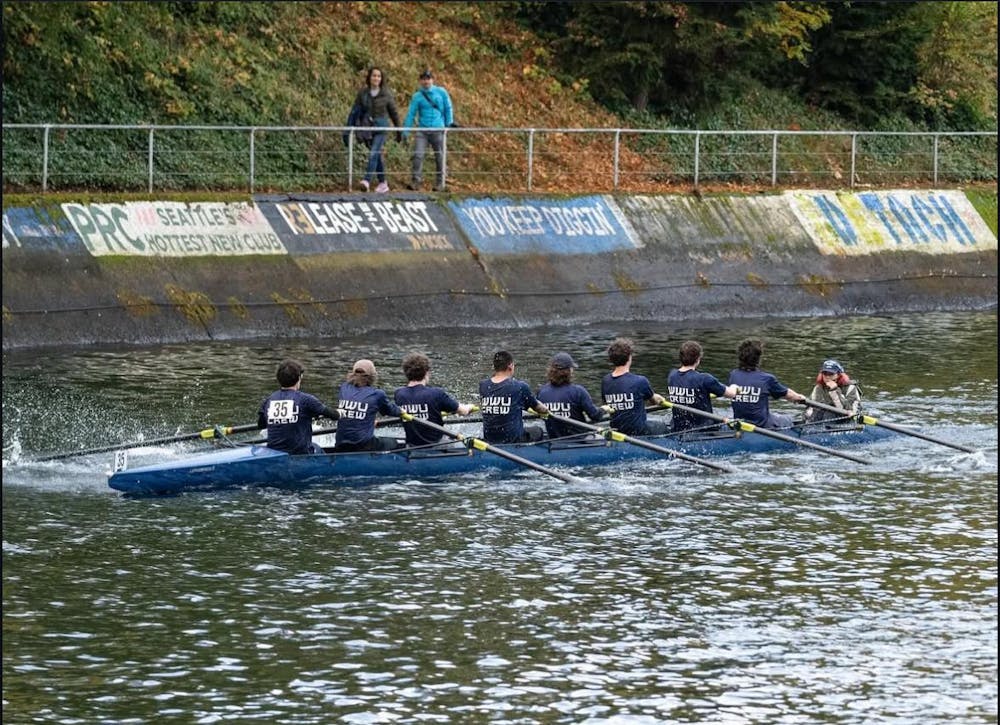 Western Men’s rowing races for the finish line in November 2024. The team competed at the Head of the Lake regatta in Seattle, Wash. // Photo courtesy of Javin Morrison.